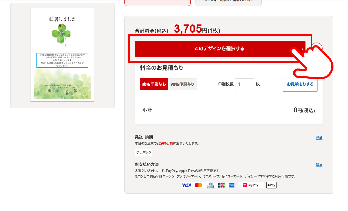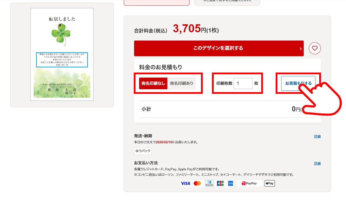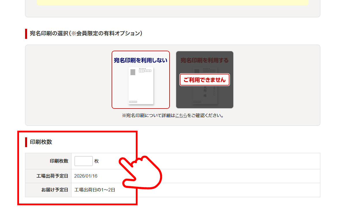 印刷枚数を入力・選択し、出荷予定日・お届け予定日をご確認ください。