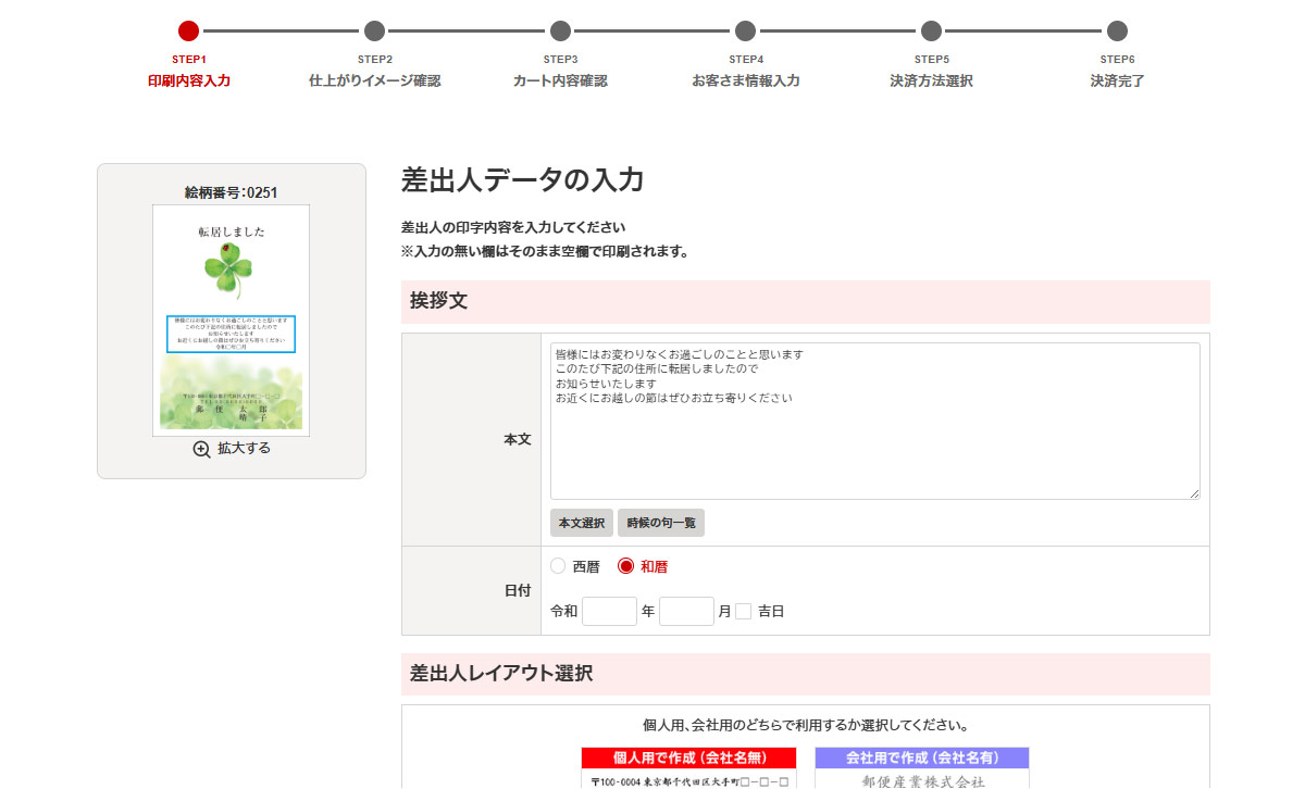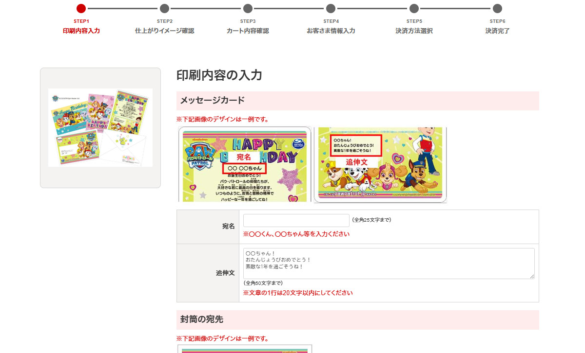 印刷するメッセージ内容・封筒の宛先を入力、お届け日を選択してください。