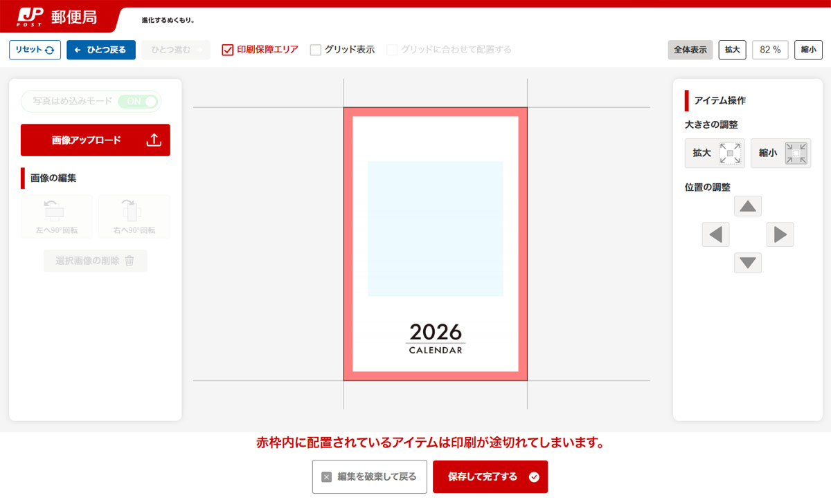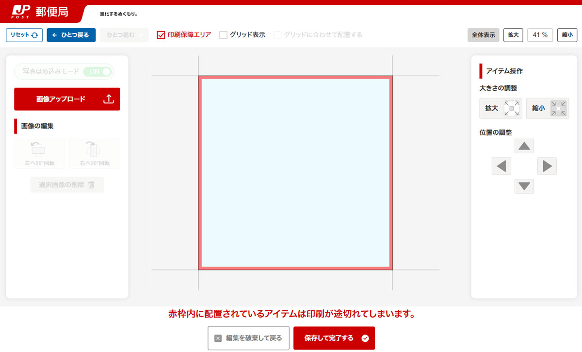 印刷したい画像をアップロード・配置した方は、ボタン「保存して完了する」を選択し、レイアウト選択画面へお戻りください。