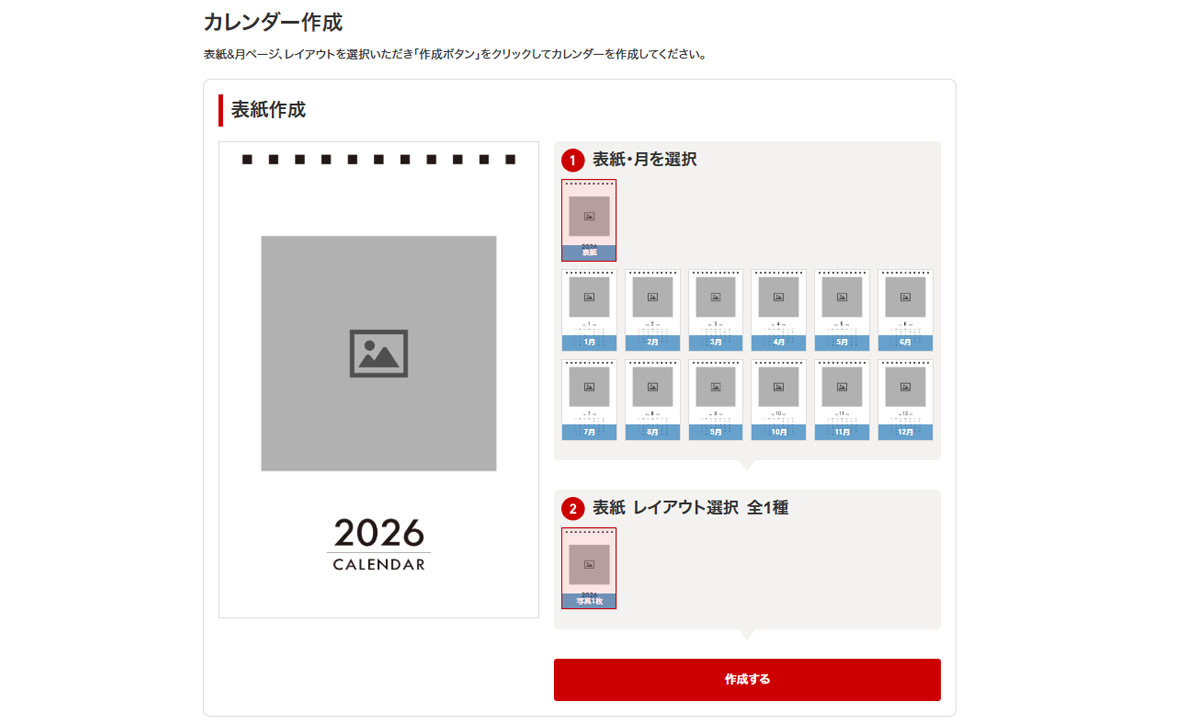 ①表紙・月を選択、②レイアウト選択、③コメント入力(コメントを印刷する場合)を設定し、ボタン「作成する」から画像アップロード画面へお進みください。