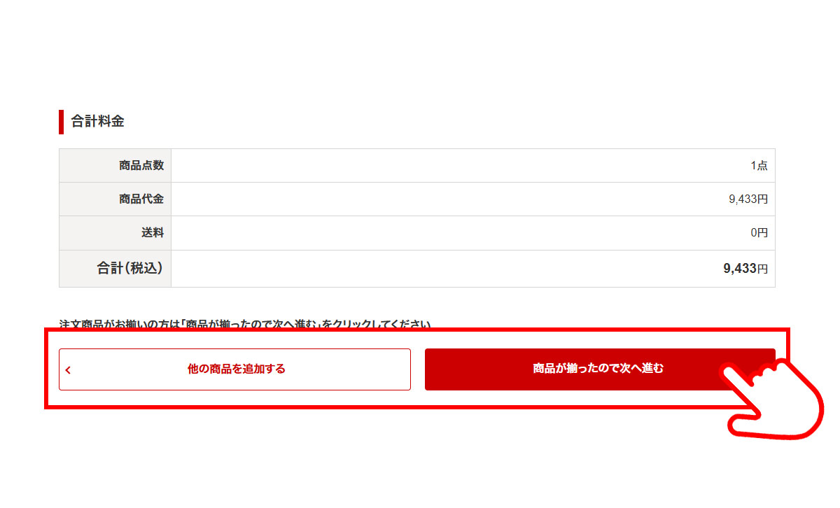- 購入に進む場合:ボタン「商品が揃ったので次へ進む」を選択してください。