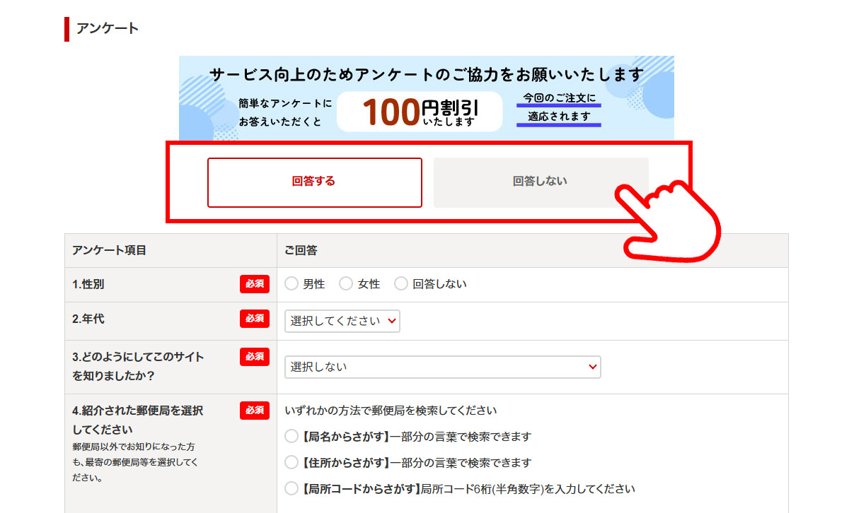 アンケートにご回答いただくと、アンケート割引が適用されます。