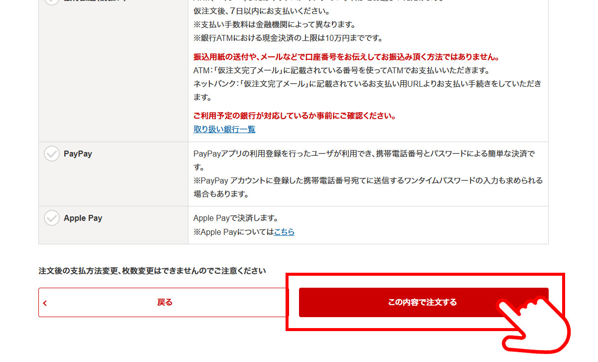 ※銀行決済、コンビニ前払いの場合は仮注文となり、入金完了時点で本注文となります。