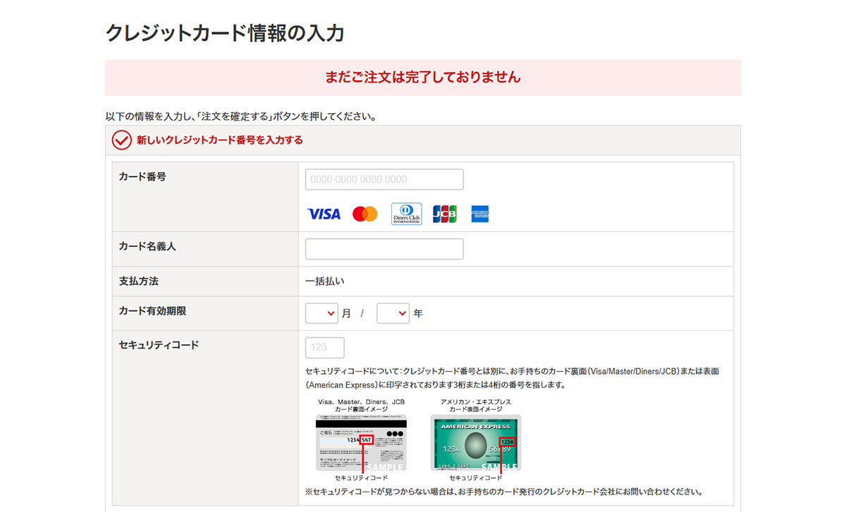 - 「クレジットカード情報の入力」ページに移動しますので、カード情報を入力してください。